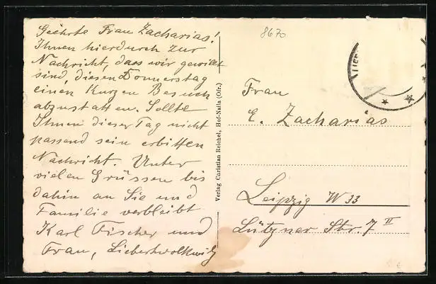 alte Ansichtskarte, gelaufen, Briefmarke entfernt, guter Zustand