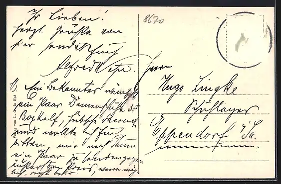 alte Ansichtskarte, gelaufen, Briefmarke entfernt, rückseitig Oberflächenschaden, Stempelspur, guter Zustand