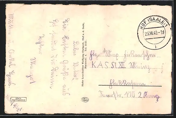 Personenbezogene Daten auf der Rückseite der Karte wurden durch blauen Textmarker unkenntlich gemacht. Die blauen Stellen sind auf die Vorderseite durchgeweicht und wirken sich negativ auf das Postkartenfoto aus