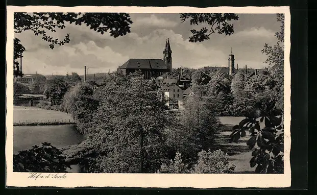 AK Hof a. d. Saale, Ortspartie mit Kirche