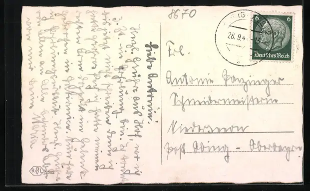 Personenbezogene Daten auf der Rückseite der Karte wurden durch blauen Textmarker unkenntlich gemacht. Die blauen Stellen sind auf die Vorderseite durchgeweicht und wirken sich negativ auf das Postkartenfoto aus