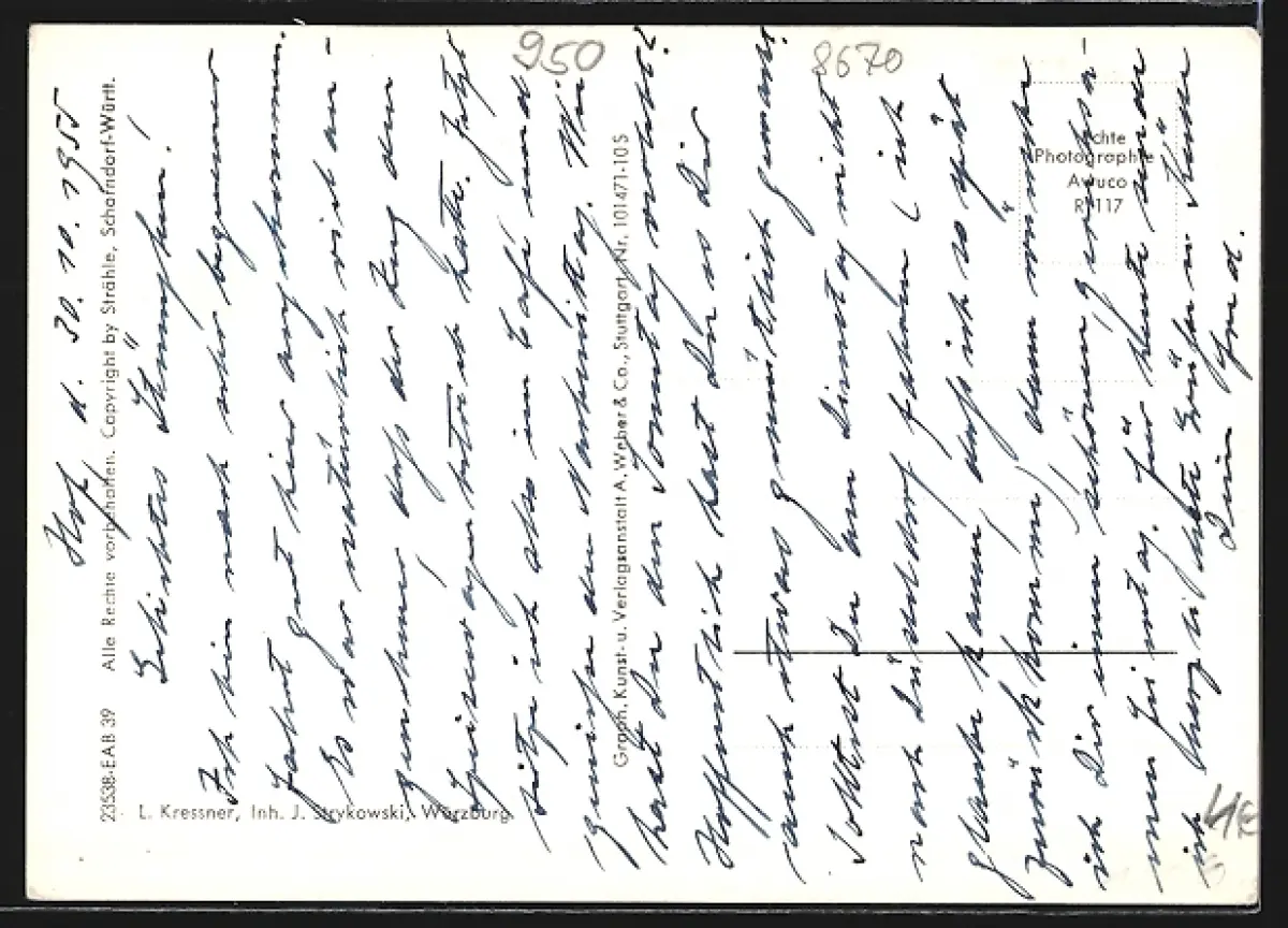 Personenbezogene Daten auf der Rückseite der Karte wurden durch blauen Textmarker unkenntlich gemacht. Die blauen Stellen sind auf die Vorderseite durchgeweicht und wirken sich negativ auf das Postkartenfoto aus