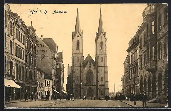 AK Hof i. B., Altstadt, Strassenpartie mit Kirche
