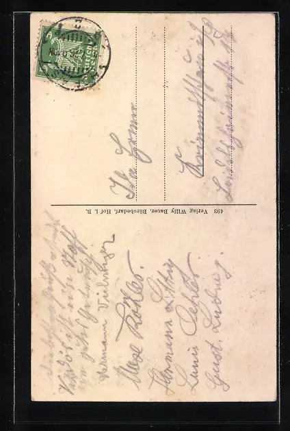 Personenbezogene Daten auf der Rückseite der Karte wurden durch blauen Textmarker unkenntlich gemacht. Die blauen Stellen sind auf die Vorderseite durchgeweicht und wirken sich negativ auf das Postkartenfoto aus