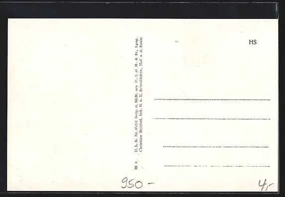 Personenbezogene Daten auf der Rückseite der Karte wurden durch blauen Textmarker unkenntlich gemacht. Die blauen Stellen sind auf die Vorderseite durchgeweicht und wirken sich negativ auf das Postkartenfoto aus