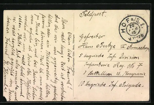 alte Ansichtskarte, gelaufen 1915, Eckknick unten li., Eckschaden unten re., guter Zustand
