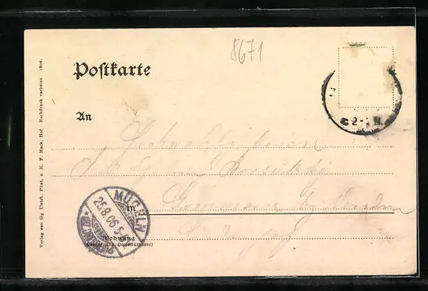 gelaufen 1906, Briefmarke tw. entfernt, Eckknick li. unten, Stempelspur, guter Zustand