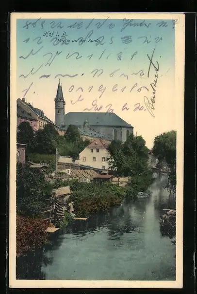 Personenbezogene Daten auf der Rückseite der Karte wurden durch blauen Textmarker unkenntlich gemacht. Die blauen Stellen sind auf die Vorderseite durchgeweicht und wirken sich negativ auf das Postkartenfoto aus