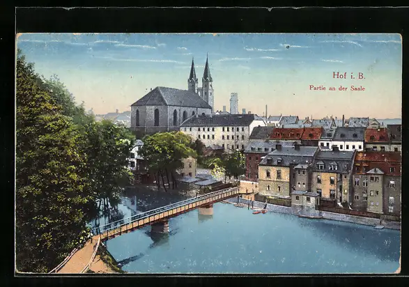 AK Hof i. B., Partie an der Saale bei Dämmerung