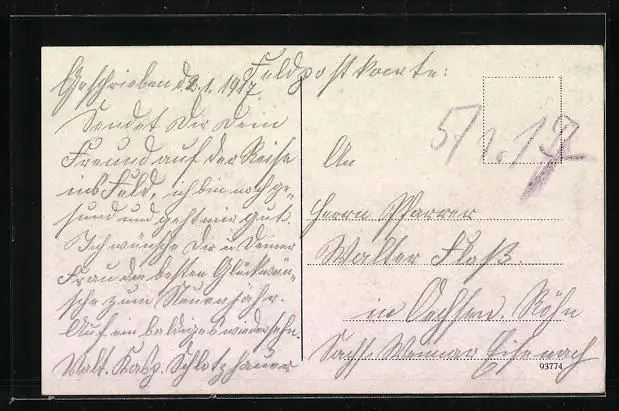 Personenbezogene Daten auf der Rückseite der Karte wurden durch blauen Textmarker unkenntlich gemacht. Die blauen Stellen sind auf die Vorderseite durchgeweicht und wirken sich negativ auf das Postkartenfoto aus