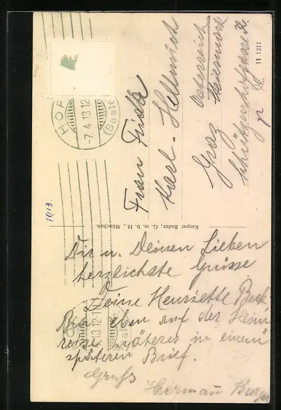 alte Ansichtskarte, gelaufen 1913, Briefmarke entfernt, rückseitig Oberflächenschaden, guter Zustand