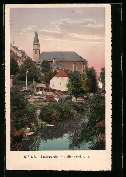 AK Hof i. B., Saalepartie mit Michaelskirche