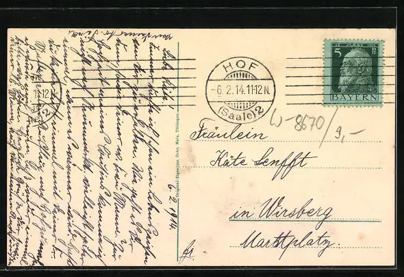 Personenbezogene Daten auf der Rückseite der Karte wurden durch blauen Textmarker unkenntlich gemacht. Die blauen Stellen sind auf die Vorderseite durchgeweicht und wirken sich negativ auf das Postkartenfoto aus