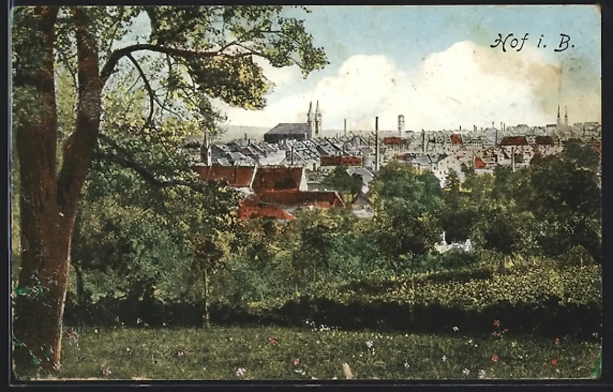 AK Hof i. B., Stadtansicht mit Kirche und Fabrikschornsteinen