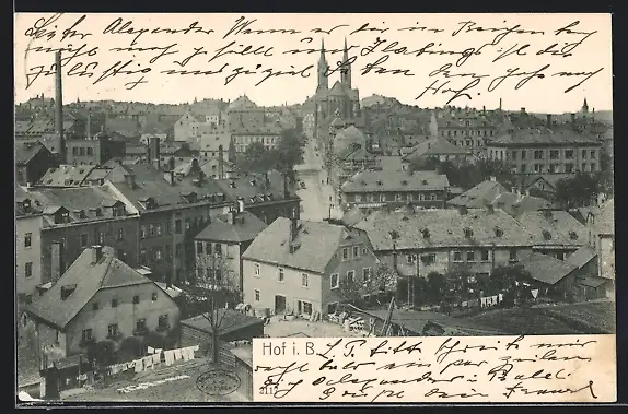 AK Hof i. B., Stadtansicht mit Kirche und Hinterhöfen