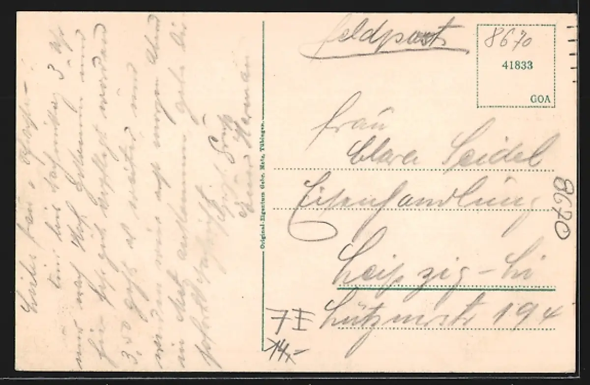 Personenbezogene Daten auf der Rückseite der Karte wurden durch blauen Textmarker unkenntlich gemacht. Die blauen Stellen sind auf die Vorderseite durchgeweicht und wirken sich negativ auf das Postkartenfoto aus