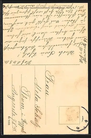 Personenbezogene Daten auf der Rückseite der Karte wurden durch blauen Textmarker unkenntlich gemacht. Die blauen Stellen sind auf die Vorderseite durchgeweicht und wirken sich negativ auf das Postkartenfoto aus