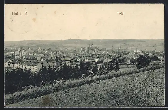 AK Hof i. B., Totalansicht von einer Anhöhe aus
