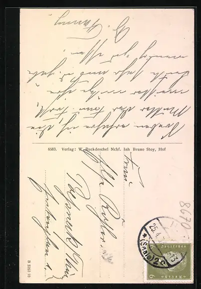 Personenbezogene Daten auf der Rückseite der Karte wurden durch blauen Textmarker unkenntlich gemacht. Die blauen Stellen sind auf die Vorderseite durchgeweicht und wirken sich negativ auf das Postkartenfoto aus