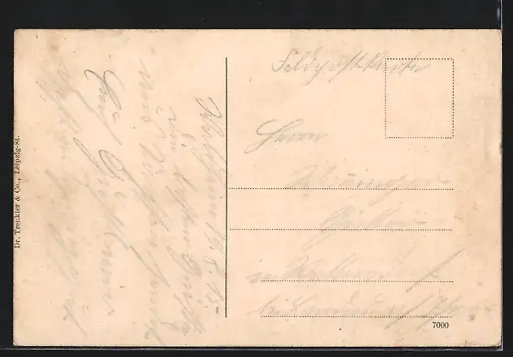Personenbezogene Daten auf der Rückseite der Karte wurden durch blauen Textmarker unkenntlich gemacht. Die blauen Stellen sind auf die Vorderseite durchgeweicht und wirken sich negativ auf das Postkartenfoto aus