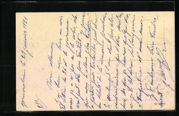 Personenbezogene Daten auf der Rückseite der Karte wurden durch blauen Textmarker unkenntlich gemacht. Die blauen Stellen sind auf die Vorderseite durchgeweicht und wirken sich negativ auf das Postkartenfoto aus