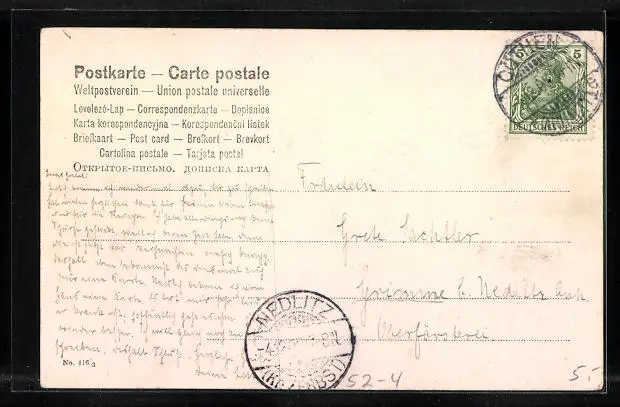 Personenbezogene Daten auf der Rückseite der Karte wurden durch blauen Textmarker unkenntlich gemacht. Die blauen Stellen sind auf die Vorderseite durchgeweicht und wirken sich negativ auf das Postkartenfoto aus