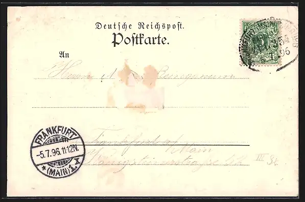 gelaufen 1896, Eckknicke oben, rückseitig Klebe- und Papierreste, guter Zustand