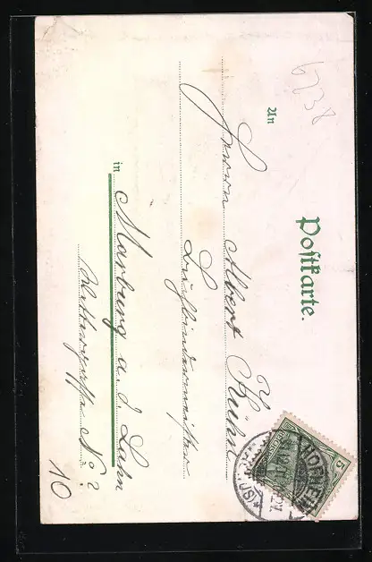 Personenbezogene Daten auf der Rückseite der Karte wurden durch blauen Textmarker unkenntlich gemacht. Die blauen Stellen sind auf die Vorderseite durchgeweicht und wirken sich negativ auf das Postkartenfoto aus