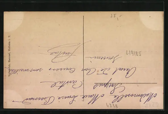 Personenbezogene Daten auf der Rückseite der Karte wurden durch blauen Textmarker unkenntlich gemacht. Die blauen Stellen sind auf die Vorderseite durchgeweicht und wirken sich negativ auf das Postkartenfoto aus