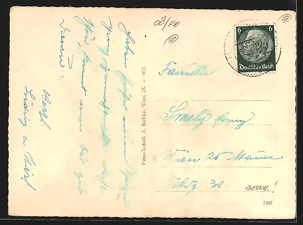 Personenbezogene Daten auf der Rückseite der Karte wurden durch blauen Textmarker unkenntlich gemacht. Die blauen Stellen sind auf die Vorderseite durchgeweicht und wirken sich negativ auf das Postkartenfoto aus