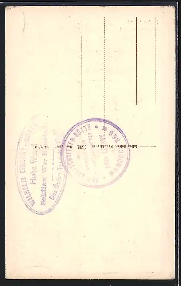 Personenbezogene Daten auf der Rückseite der Karte wurden durch blauen Textmarker unkenntlich gemacht. Die blauen Stellen sind auf die Vorderseite durchgeweicht und wirken sich negativ auf das Postkartenfoto aus