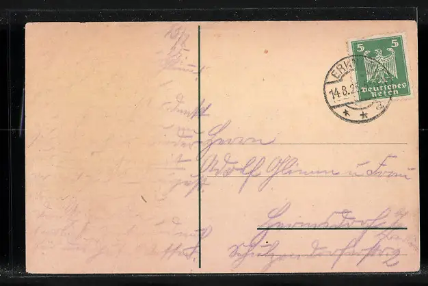 Personenbezogene Daten auf der Rückseite der Karte wurden durch blauen Textmarker unkenntlich gemacht. Die blauen Stellen sind auf die Vorderseite durchgeweicht und wirken sich negativ auf das Postkartenfoto aus