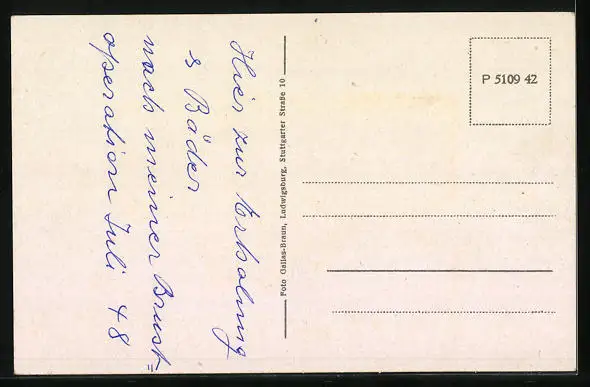 Personenbezogene Daten auf der Rückseite der Karte wurden durch blauen Textmarker unkenntlich gemacht. Die blauen Stellen sind auf die Vorderseite durchgeweicht und wirken sich negativ auf das Postkartenfoto aus