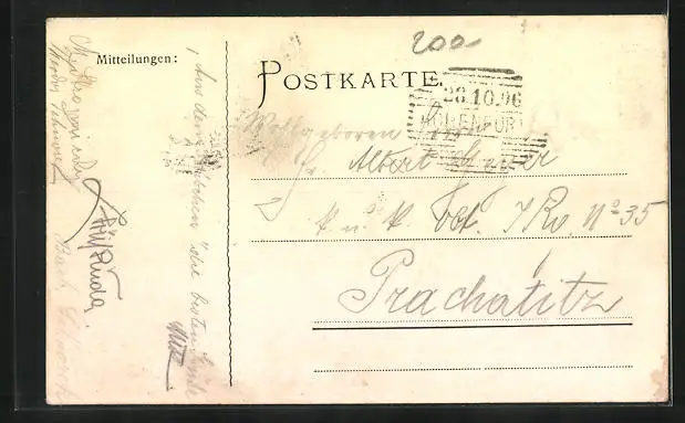 Personenbezogene Daten auf der Rückseite der Karte wurden durch blauen Textmarker unkenntlich gemacht. Die blauen Stellen sind auf die Vorderseite durchgeweicht und wirken sich negativ auf das Postkartenfoto aus