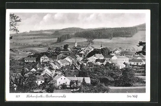 AK Hohenfurt, Ortsansicht und Hügellandschaft