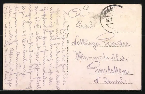 Personenbezogene Daten auf der Rückseite der Karte wurden durch blauen Textmarker unkenntlich gemacht. Die blauen Stellen sind auf die Vorderseite durchgeweicht und wirken sich negativ auf das Postkartenfoto aus