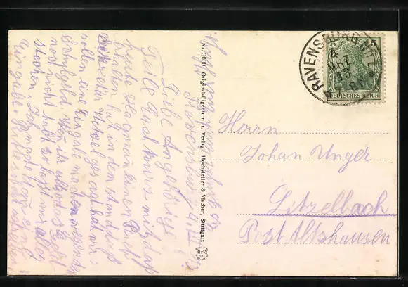 Personenbezogene Daten auf der Rückseite der Karte wurden durch blauen Textmarker unkenntlich gemacht. Die blauen Stellen sind auf die Vorderseite durchgeweicht und wirken sich negativ auf das Postkartenfoto aus