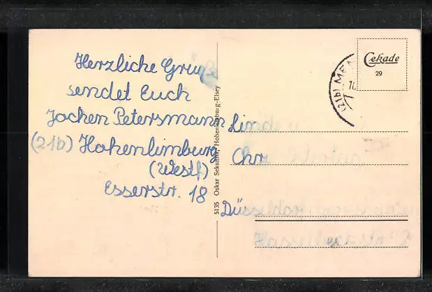 Personenbezogene Daten auf der Rückseite der Karte wurden durch blauen Textmarker unkenntlich gemacht. Die blauen Stellen sind auf die Vorderseite durchgeweicht und wirken sich negativ auf das Postkartenfoto aus