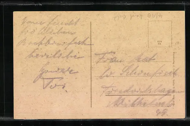 Personenbezogene Daten auf der Rückseite der Karte wurden durch blauen Textmarker unkenntlich gemacht. Die blauen Stellen sind auf die Vorderseite durchgeweicht und wirken sich negativ auf das Postkartenfoto aus