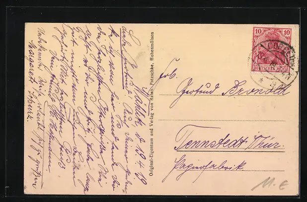 Personenbezogene Daten auf der Rückseite der Karte wurden durch blauen Textmarker unkenntlich gemacht. Die blauen Stellen sind auf die Vorderseite durchgeweicht und wirken sich negativ auf das Postkartenfoto aus
