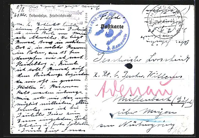 Personenbezogene Daten auf der Rückseite der Karte wurden durch blauen Textmarker unkenntlich gemacht. Die blauen Stellen sind auf die Vorderseite durchgeweicht und wirken sich negativ auf das Postkartenfoto aus