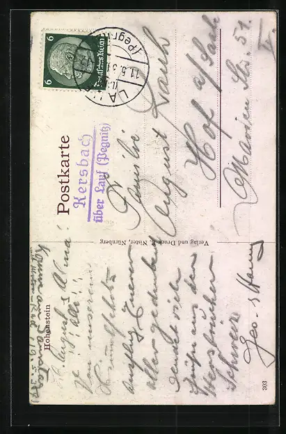 Personenbezogene Daten auf der Rückseite der Karte wurden durch blauen Textmarker unkenntlich gemacht. Die blauen Stellen sind auf die Vorderseite durchgeweicht und wirken sich negativ auf das Postkartenfoto aus