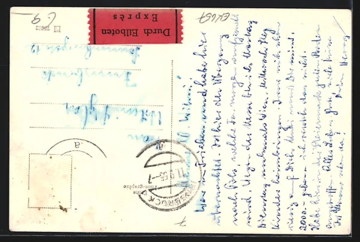 Personenbezogene Daten auf der Rückseite der Karte wurden durch blauen Textmarker unkenntlich gemacht. Die blauen Stellen sind auf die Vorderseite durchgeweicht und wirken sich negativ auf das Postkartenfoto aus