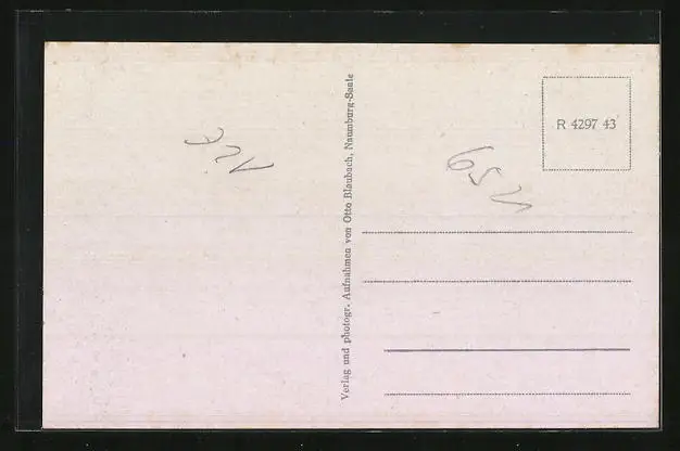 Personenbezogene Daten auf der Rückseite der Karte wurden durch blauen Textmarker unkenntlich gemacht. Die blauen Stellen sind auf die Vorderseite durchgeweicht und wirken sich negativ auf das Postkartenfoto aus