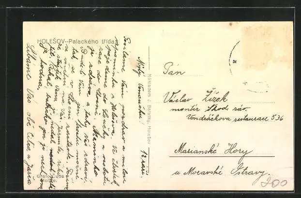 Personenbezogene Daten auf der Rückseite der Karte wurden durch blauen Textmarker unkenntlich gemacht. Die blauen Stellen sind auf die Vorderseite durchgeweicht und wirken sich negativ auf das Postkartenfoto aus