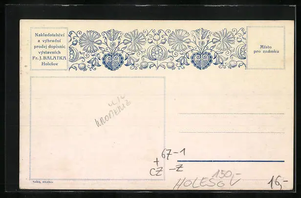 Personenbezogene Daten auf der Rückseite der Karte wurden durch blauen Textmarker unkenntlich gemacht. Die blauen Stellen sind auf die Vorderseite durchgeweicht und wirken sich negativ auf das Postkartenfoto aus