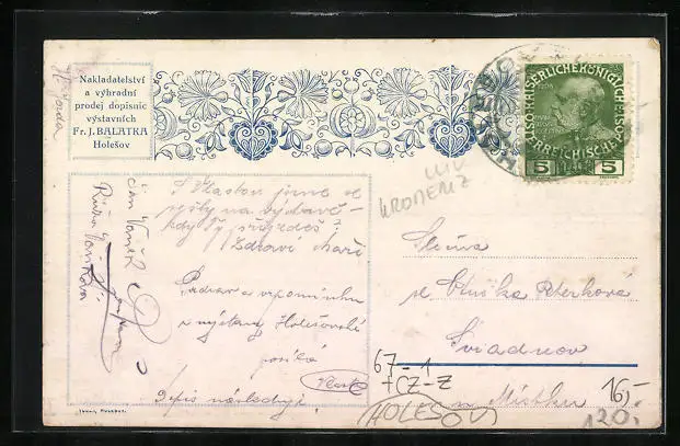Personenbezogene Daten auf der Rückseite der Karte wurden durch blauen Textmarker unkenntlich gemacht. Die blauen Stellen sind auf die Vorderseite durchgeweicht und wirken sich negativ auf das Postkartenfoto aus