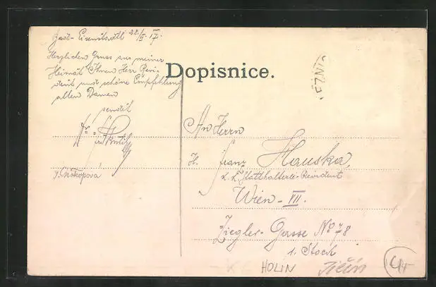 gelaufen 1917, Briefmarke entfernt, rückseitig Oberflächenschaden, Eckknicke li. oben, guter Zustand