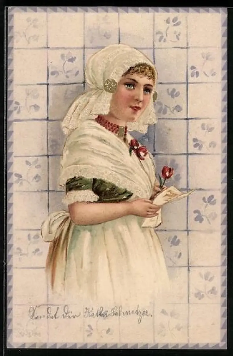 AK Holländerin mit Blume und Brief