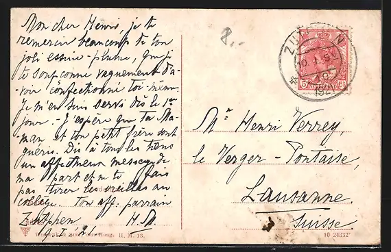 Personenbezogene Daten auf der Rückseite der Karte wurden durch blauen Textmarker unkenntlich gemacht. Die blauen Stellen sind auf die Vorderseite durchgeweicht und wirken sich negativ auf das Postkartenfoto aus
